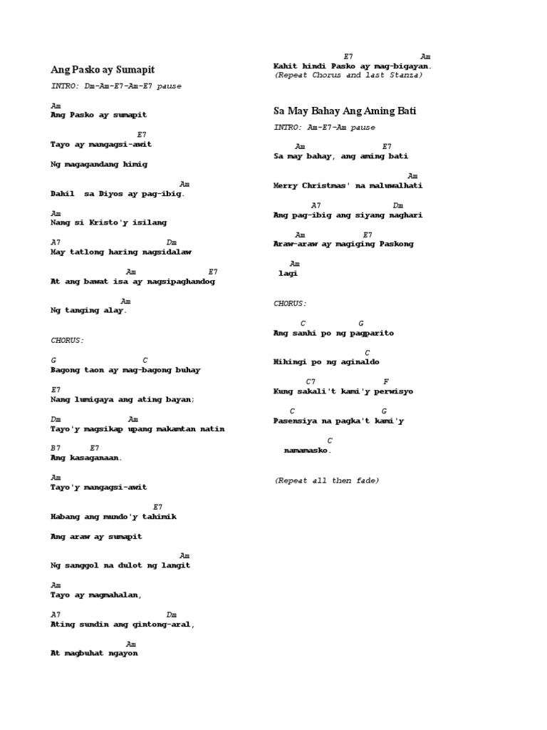 Am Ang pasko ay sumapit E Tayo ay mangagsi-awit Ng magagandang himig Am Dahil sa Diyos ay pag-ibig Am Nang si Kristoy isilang A7 May tatlong haring nagsi Dm dalaw Dm At ang bawat Am isa ay nagsipaghand E og Am Ng tanging alay II G Bagong taon ay ma C gbagong buhay E Nang lumigaya ang a Am ting bayan.