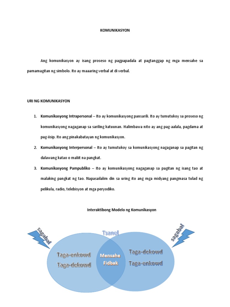 Ang komunikasyon ay hango sa salitang Latin na communis ang salitang komunikasyon naman ay hango sa Kastila at naging panumbas sa Tagalog ang katawagang pakikipagtalastasan. Encoding- ano ang mensahe paano ipadadala anu-anong salita ang gagamitin paano isasaayos anong daluyan ang gagamitin at ano ang inaasahang reaksyon ng tatanggap. Ang wika ang siyang tanging sandata o susi upang maisakatuparan ang anumang pakikipag-ugnayan ng.