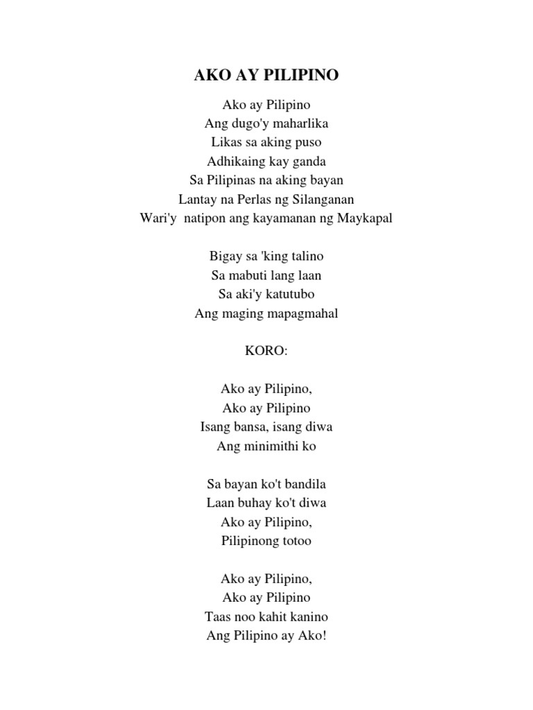 Tungkulin kung sundin ang batas sa lipunan. The time signature of. Ng Mga Anak ni Rizal MAR Ako ay Pilipino Ipinanganak na may talino Na maipapamahagi ko Para sa kapakanan ng mundo.
