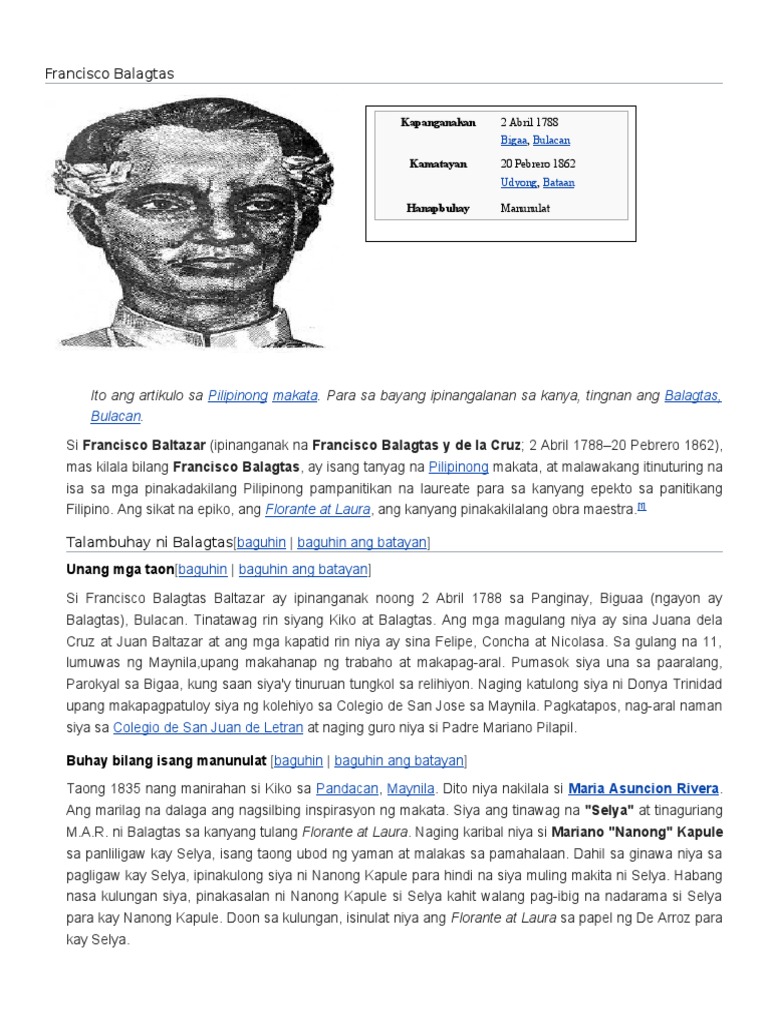 Ang isa pa ay si Epifanio de los Santos Cristobal sa kanyang aklat na Kung Sino ang. Kung nais ninyong mabása ang bersiyong Ingles nito pindutin ang Francisco Baltazar Si Francisco Baltazar y dela Cruz Abril 21788 - Pebrero 201862 kilala rin bilang Francisco Balagtas na kaniyang tunay na pangalan ay isang kilalang makata sa wikang Tagalog at may-akda ng Florante at Laura. Ang Florante at Laura ay isang tulang pasalaysay na binubuo ng tig-aapat na taludtod ang bawat saknong.